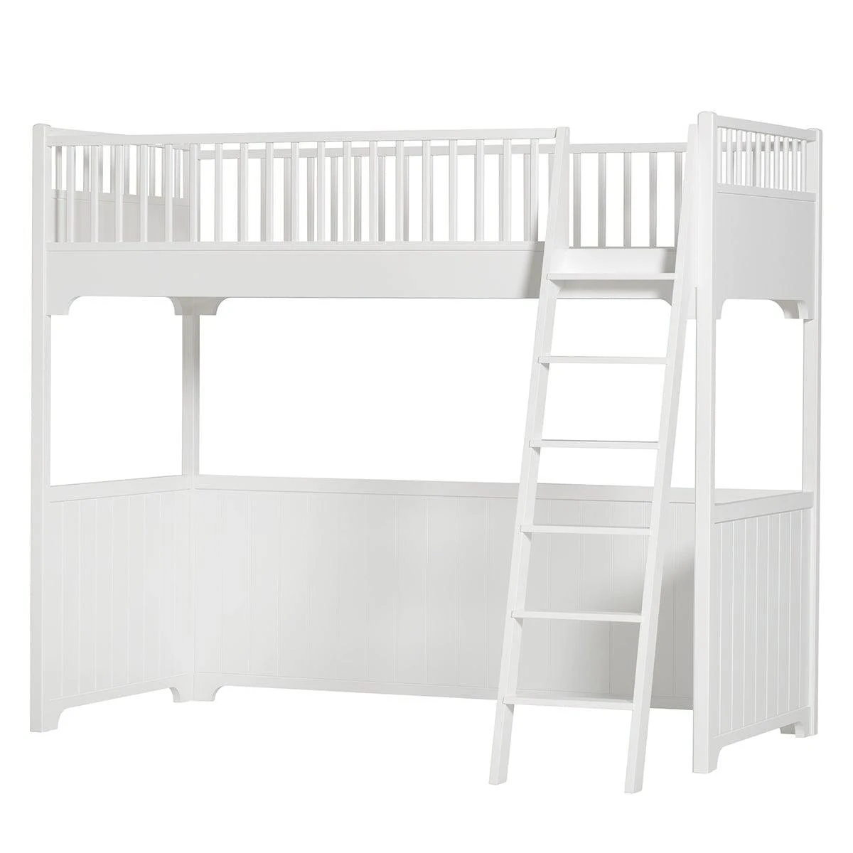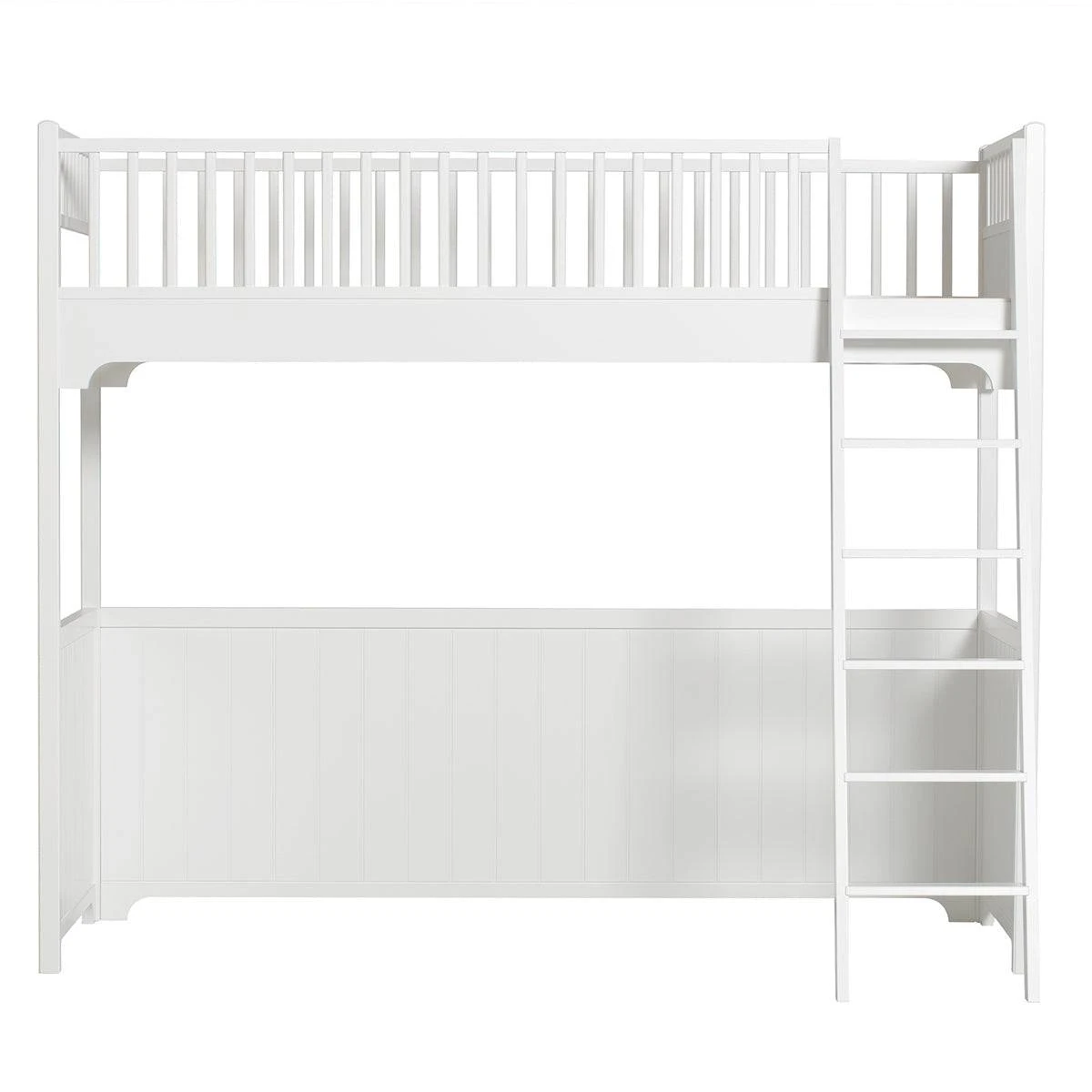 Loft bed in classic Nordic design. Both design and quality are top-class when Scandinavian furniture traditions are combined with sustainability and quality in this ‘bestseller’ of a bed. This loft bed is designed to meet the child´s need for secure and safe sleep. White wall panels underneath the bed frame a space which can be furnished individually or with classic kids´ furniture from Oliver Furniture.