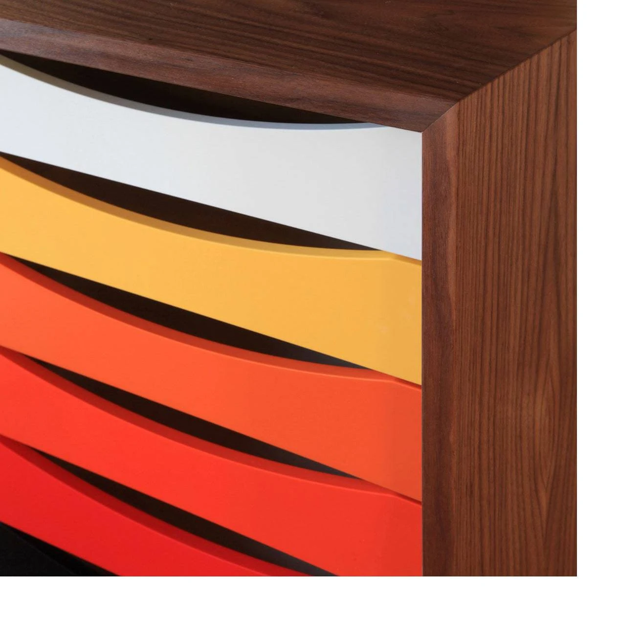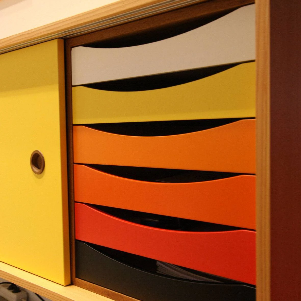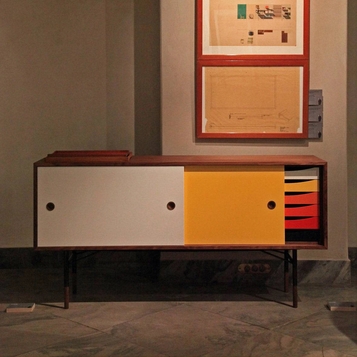 The Sideboard with coloured sliding doors and trays was designed by Finn Juhl for BOVIRKE in 1955. It is part of a theme with cubist wood cabinets that float on delicate steel frames with wood “feet” and in particular the colours which Finn Juhl arranged throughout the 1950s and 60s. The colour elements reflected his fascination with Goethe’s famous colour circle, which placed the colours in a harmonious cohesion. Finn Juhl’s own house at Ordrupgaard in Copenhagen is a bright example of his use of colours.