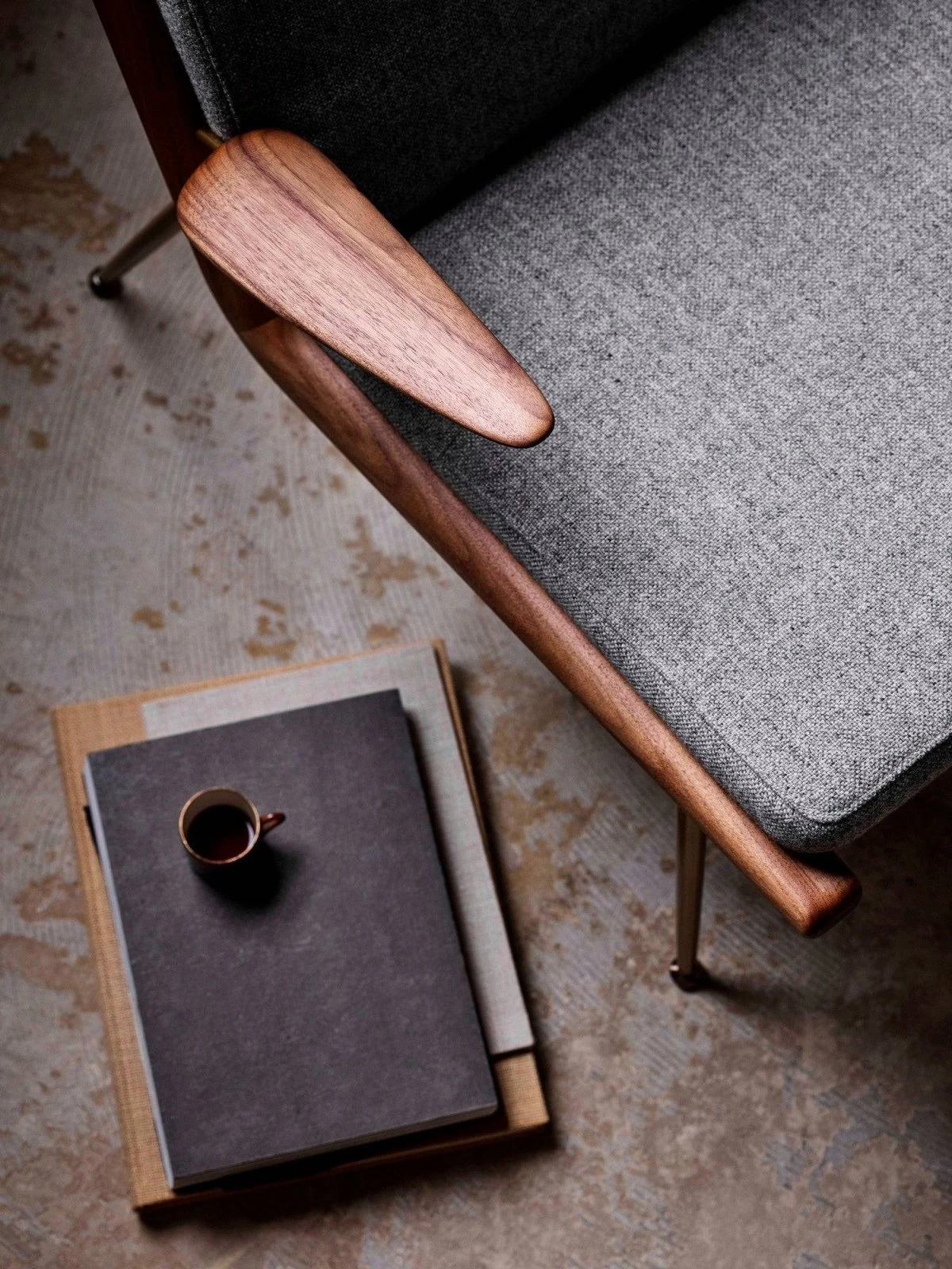 Debuted in 1956, the lounge chair by duo Hvidt & Mølgaard for &Tradition has a no-frills, streamlined form From the hand-polished wooden frame, to its slender brass legs, the Boomerang endures as a masterpiece of Danish design.