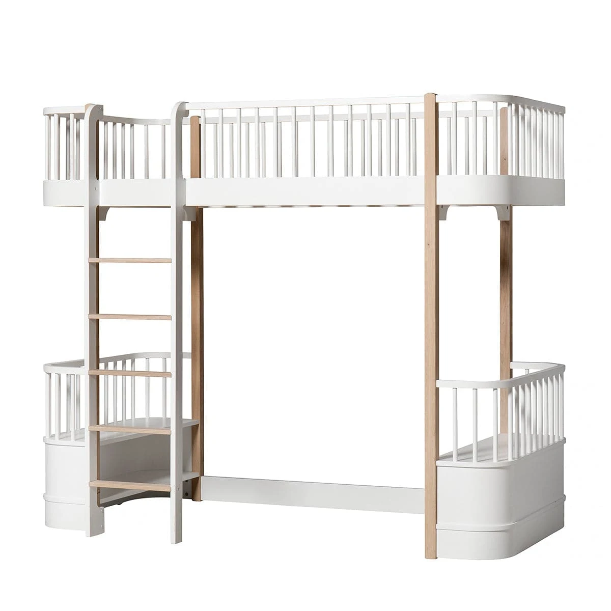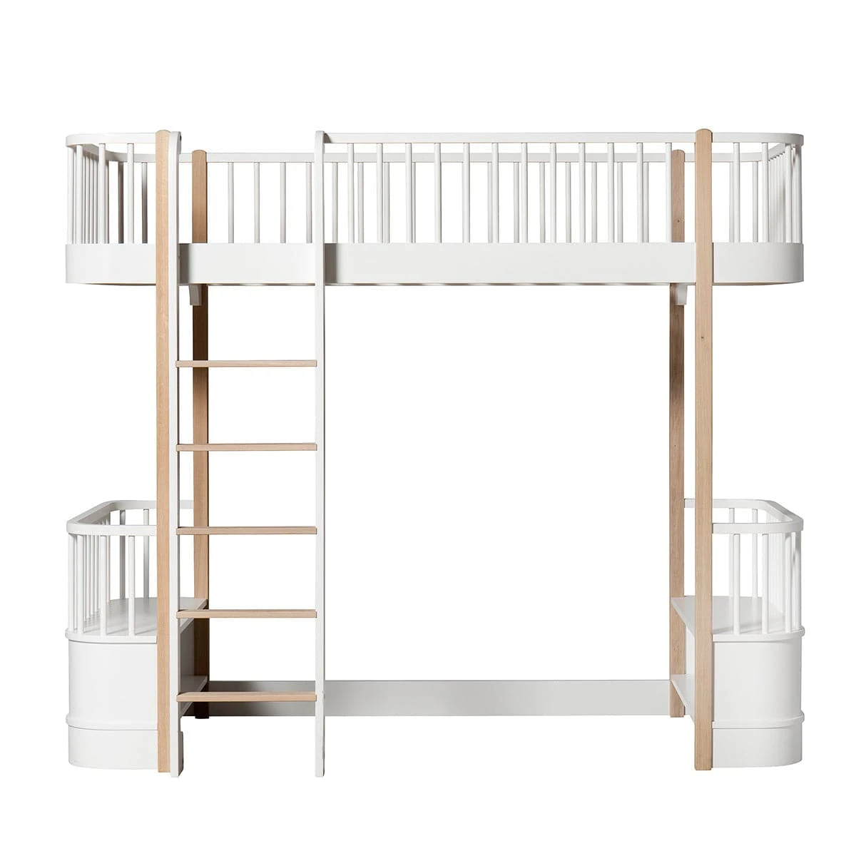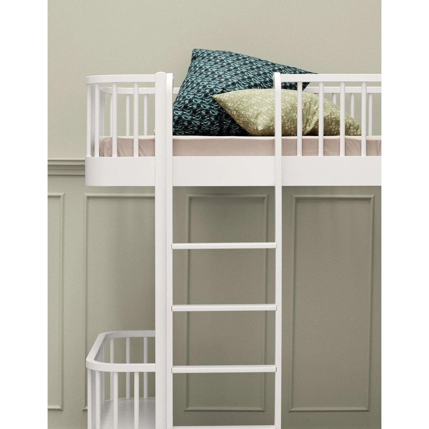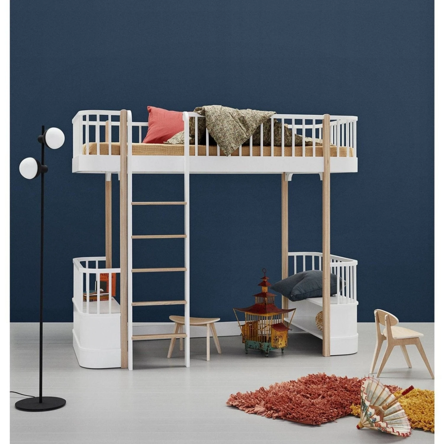The loft bed can be supplemented with a floor cushion and small table. The Wood loft bed is available in two models; one model with legs in beautiful Nordic oak (white oiled) and a model in all white.